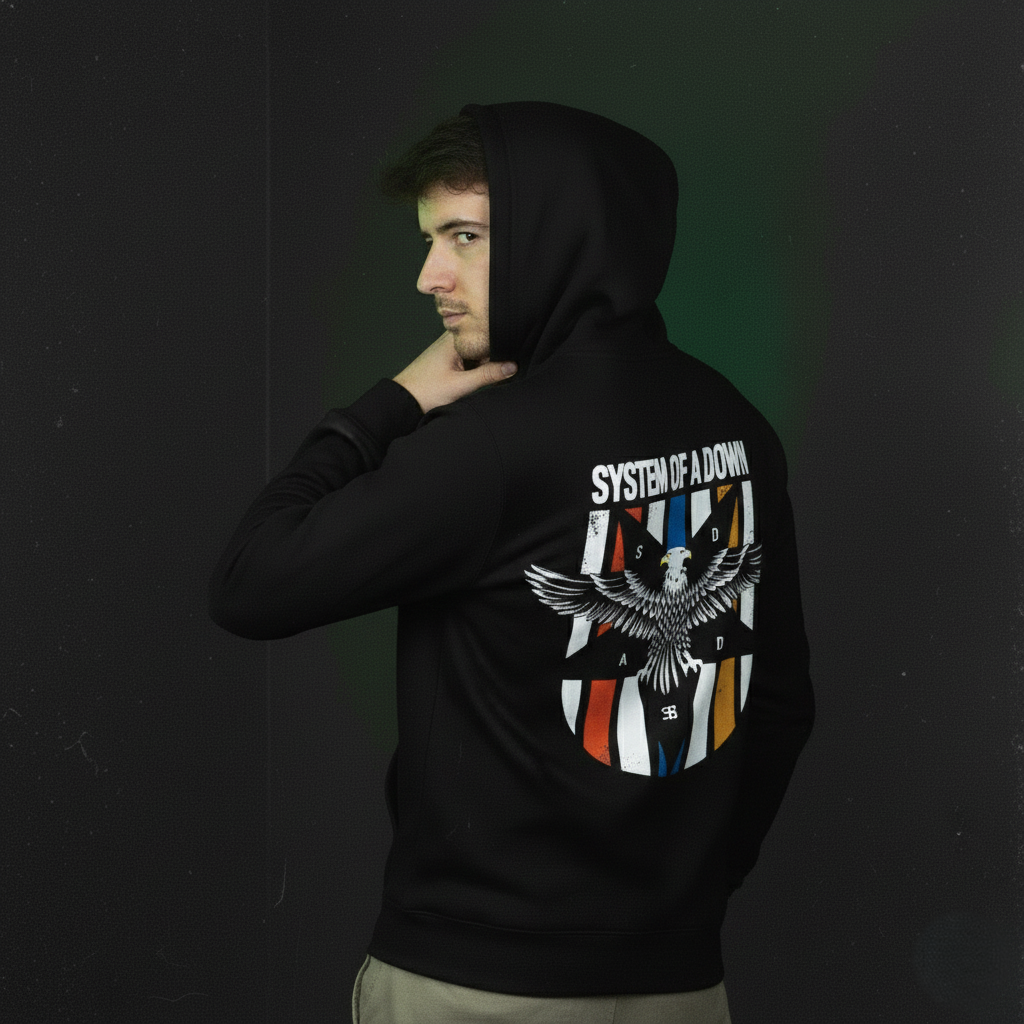 The System of a Down – Sacred Chaos Hoodie draws from the band’s explosive contrasts—aggression and satire, control and collapse. It captures resistance, confrontation, and unpredictability—translated into a warm, structured streetwear essential that refuses silence.